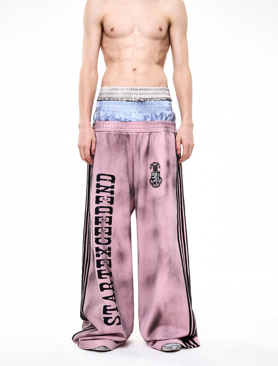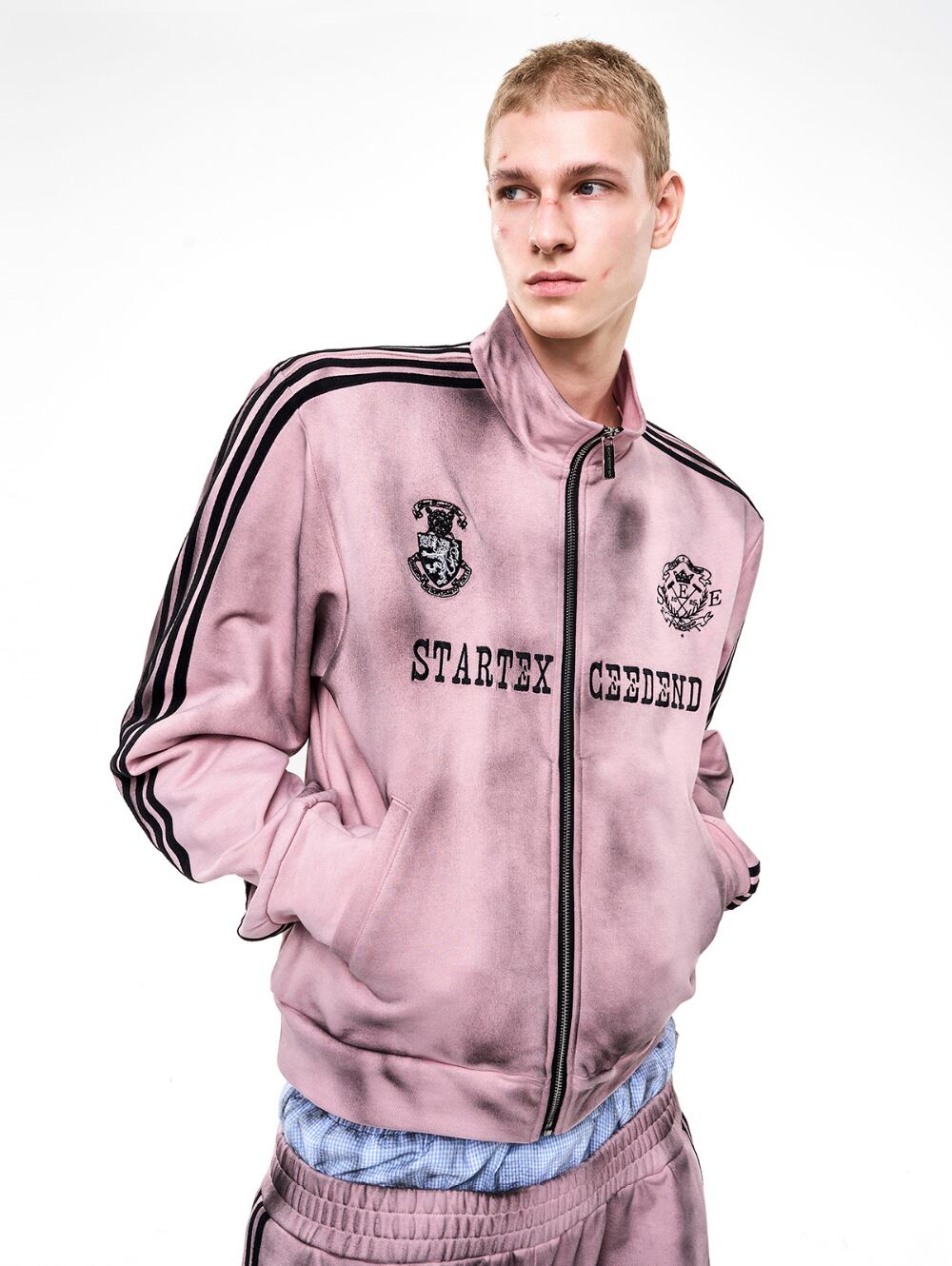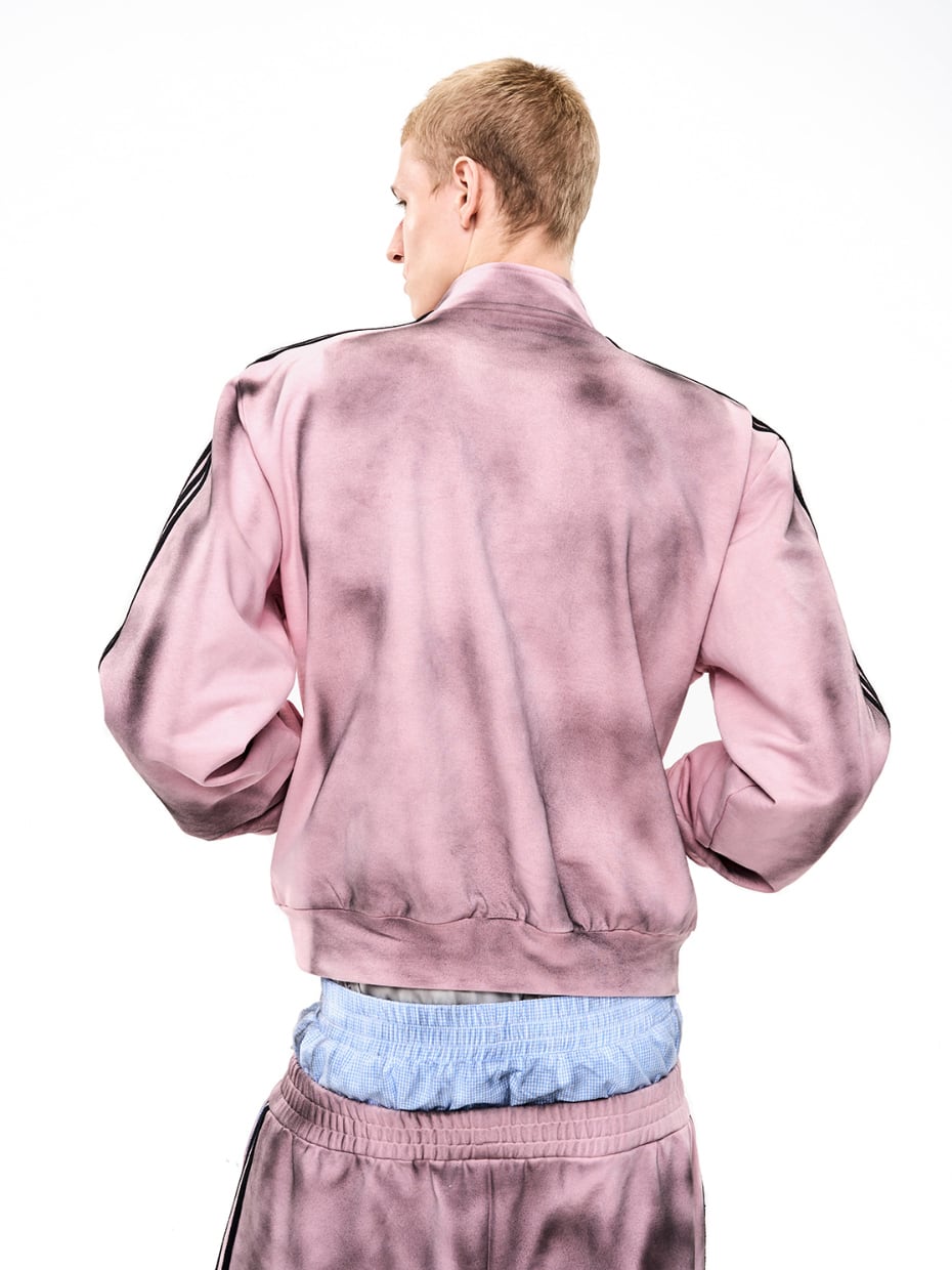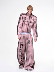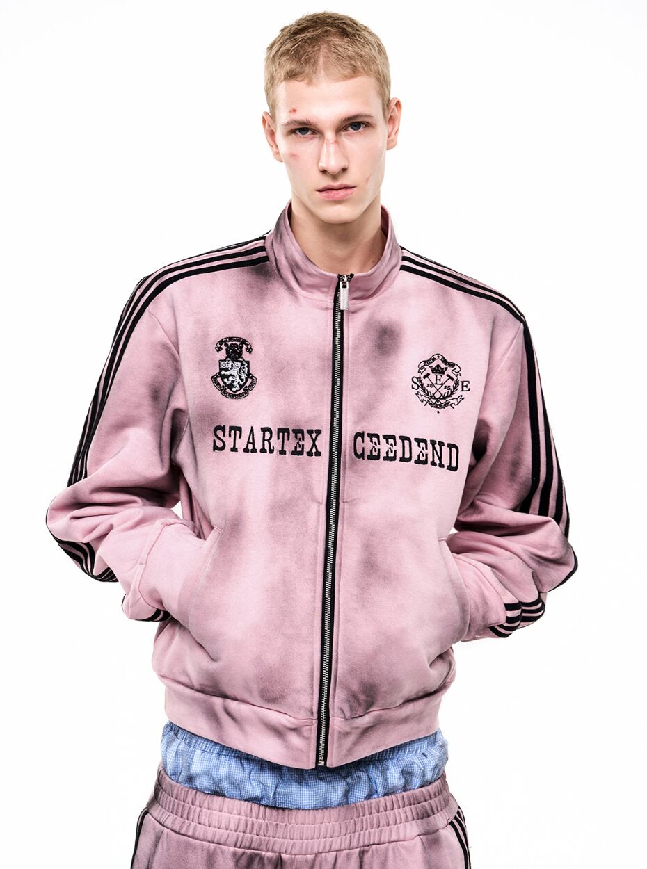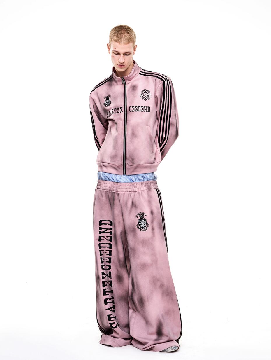 ストリートスタイルには欠かせない、汚れ加工が施されたトラックジャケットとスウェットパンツのセットアップです! 男女兼用で、誰でも気軽に着こなせるデザインが魅力です。カジュアルなコーディネートに最適なアイテムです。