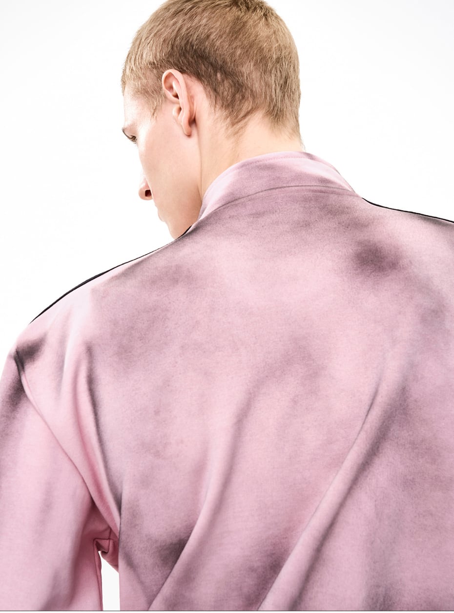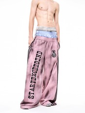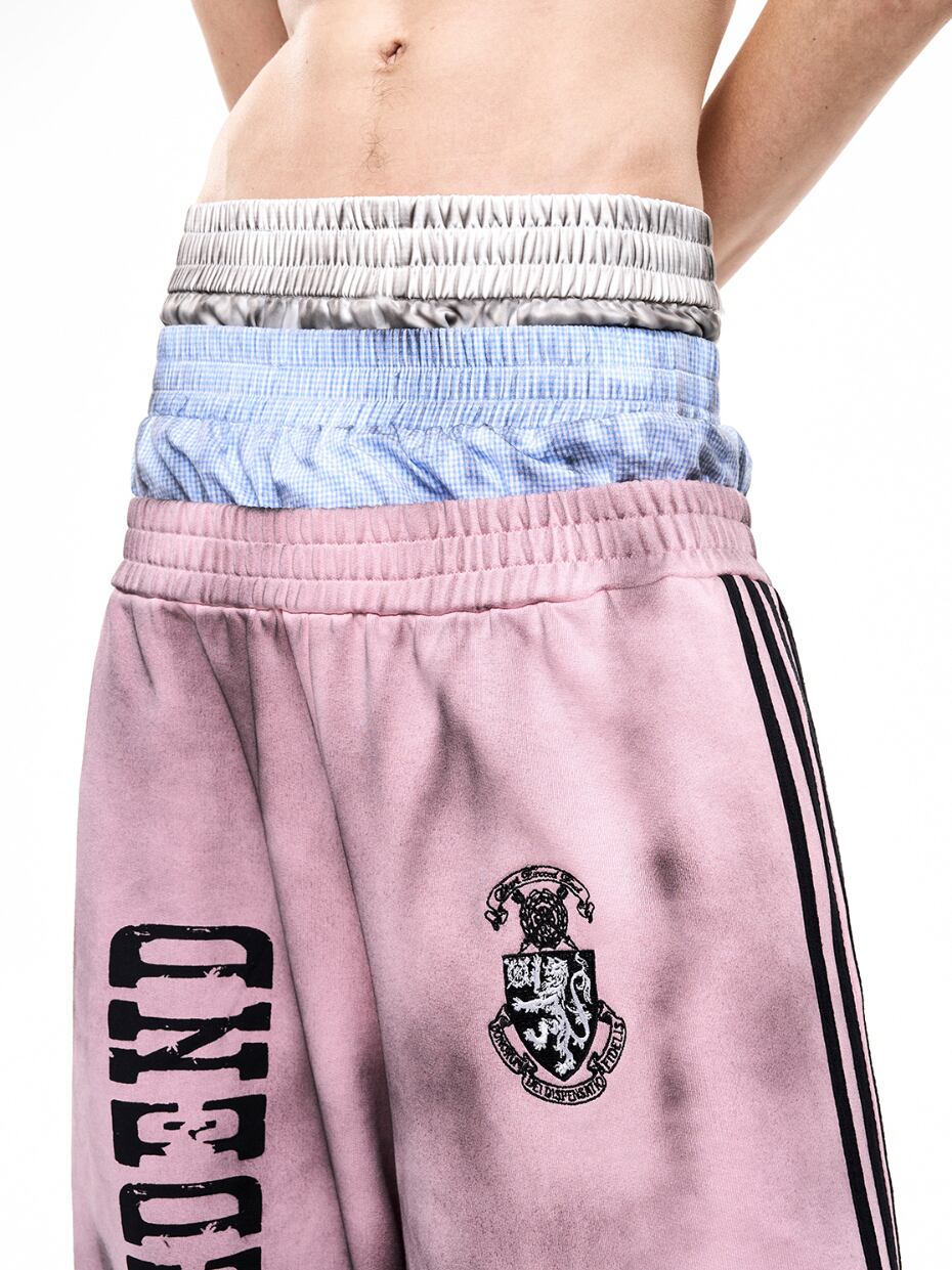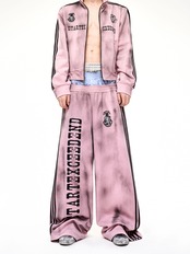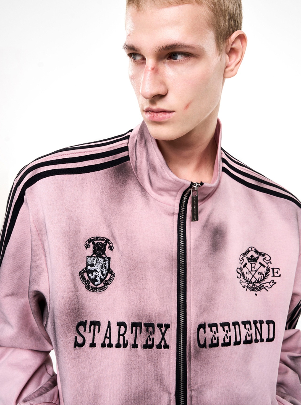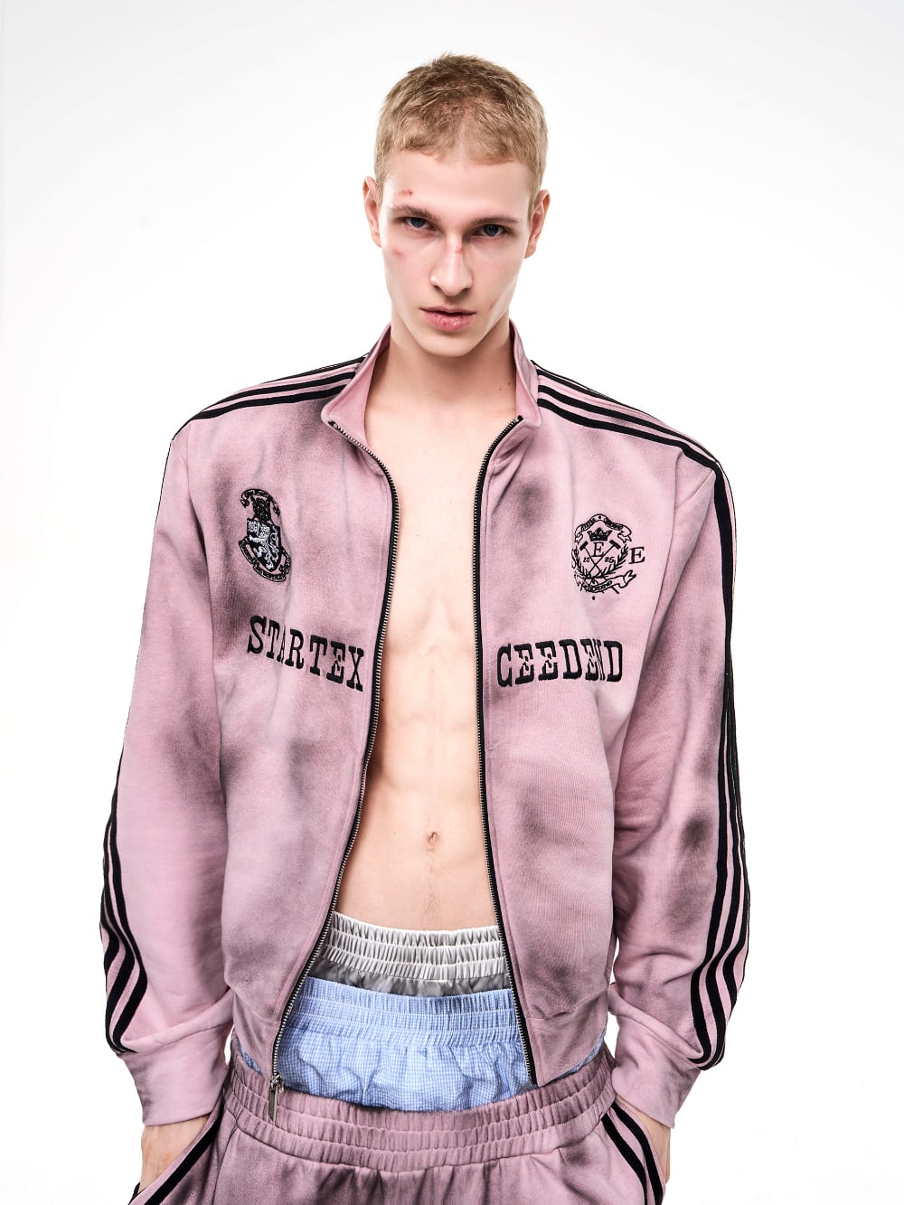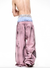 ストリートスタイルには欠かせない、汚れ加工が施されたトラックジャケットとスウェットパンツのセットアップです! 男女兼用で、誰でも気軽に着こなせるデザインが魅力です。カジュアルなコーディネートに最適なアイテムです。